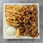 Riblja plata - 2 osobepržene lignje, lignje žar, file brancina, rižoto od kozica, krumpirići, tartar