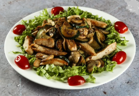 zelena salata, špek, piletina, cherry rajčica, prepečeni kruh -